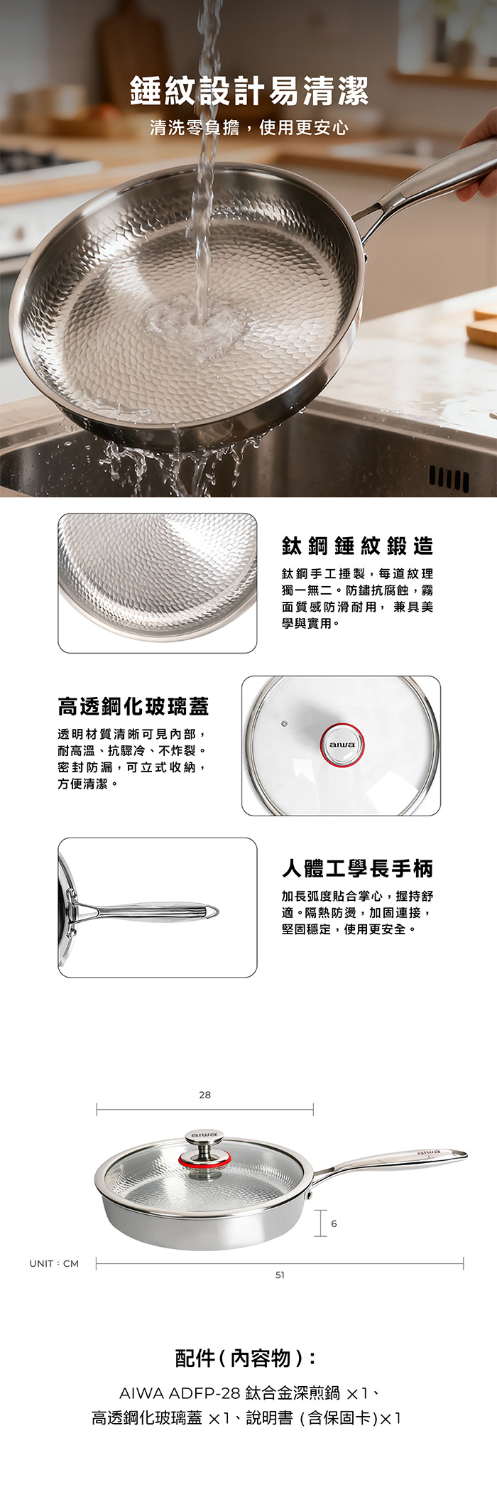 內容物:說明書(含保固卡)、鈦合金深煎鍋、鍋蓋
