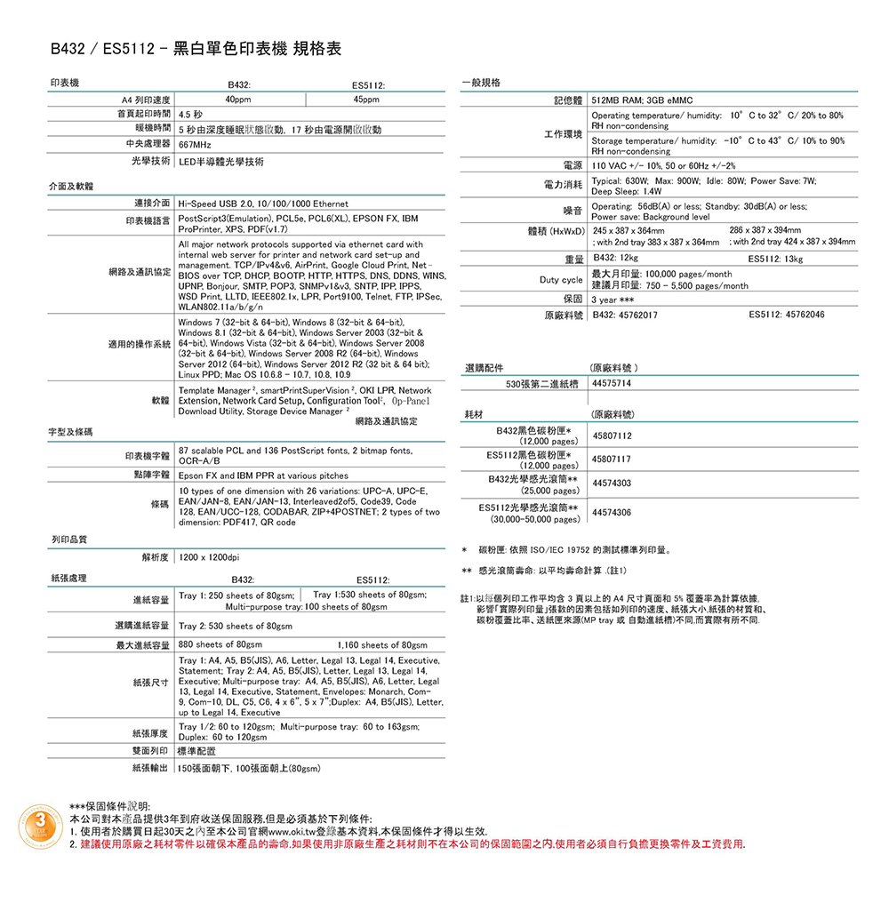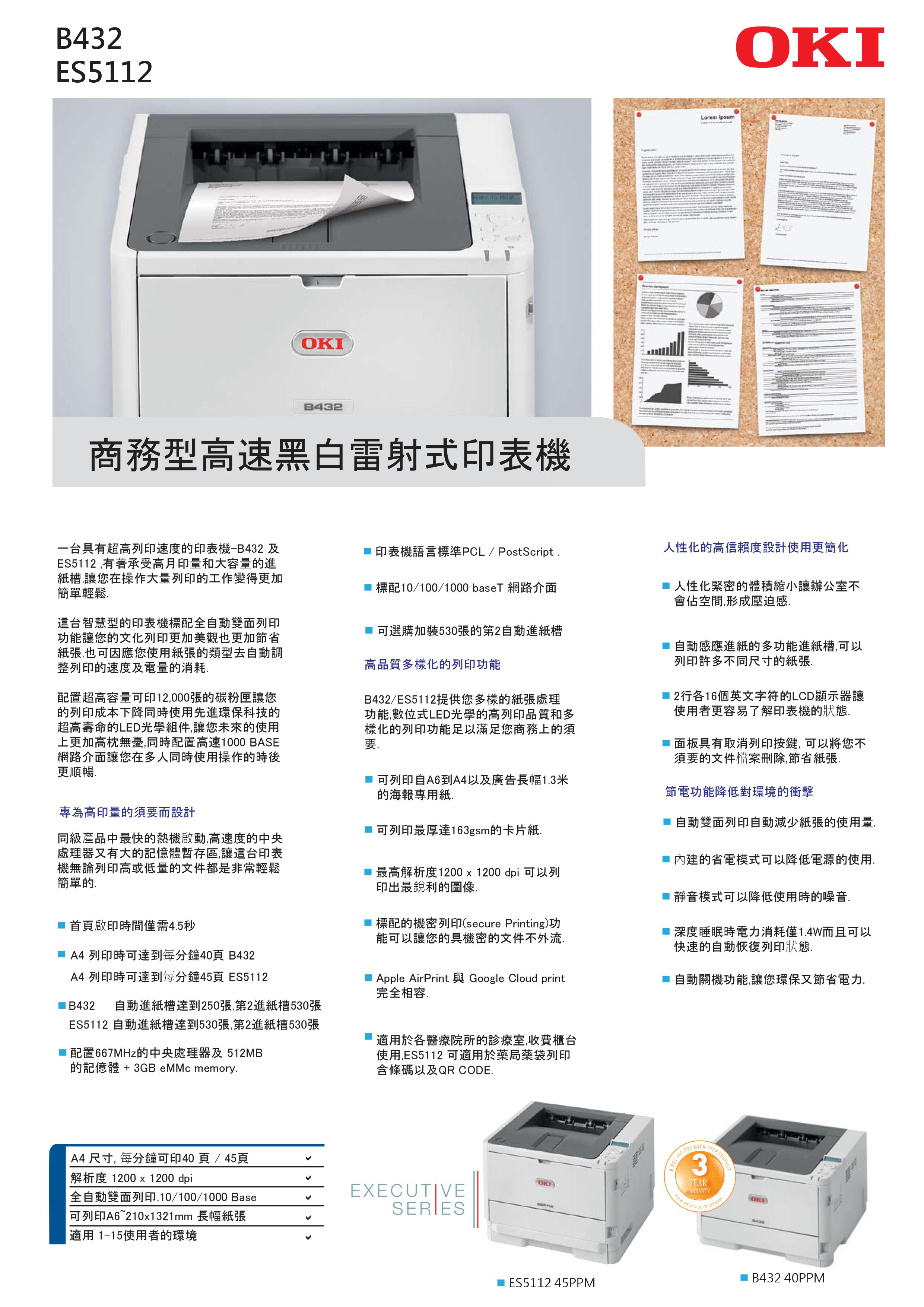 B432dn 採用高效能、可靠的數位 LED 技術,解析度為 1200 x 1200dpi,可產生出色的精細影像品質和清晰的文件。 B432dn 適用於各種不同的任務,可列印從 A6 尺寸到最長 1.3m 的橫幅以及最大 163gsm 卡片紙的紙張尺寸。