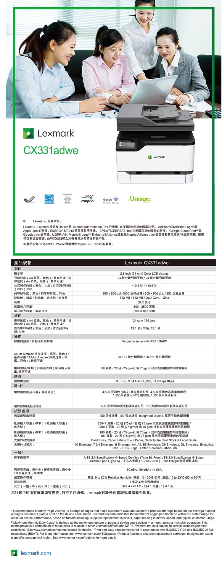 標準容量碳粉匣:黑色最高1,500頁;彩色最高1,500頁