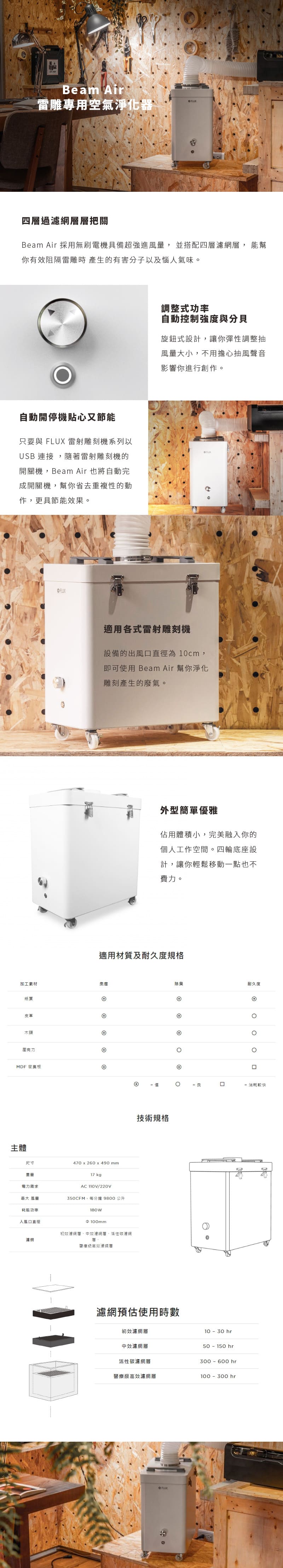 Beam Air 採用無刷電機具備超強進風量, 並搭配四層濾網層, 能幫你有效阻隔雷雕時 產生的有害分子以及惱人氣味。