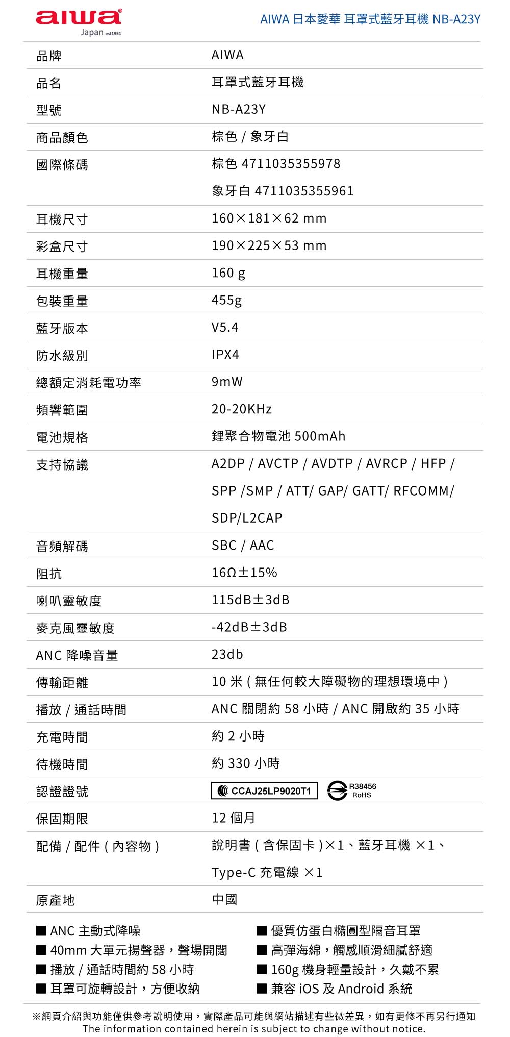 播放/通話時間:ANC關閉約58小時/ANC開啟約35小時