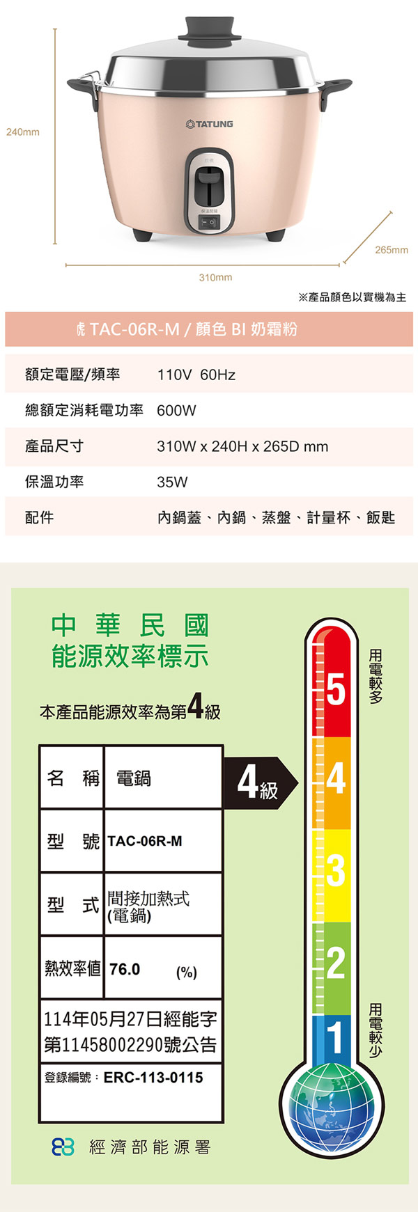 ■ 消耗功率:600W/保溫:35W