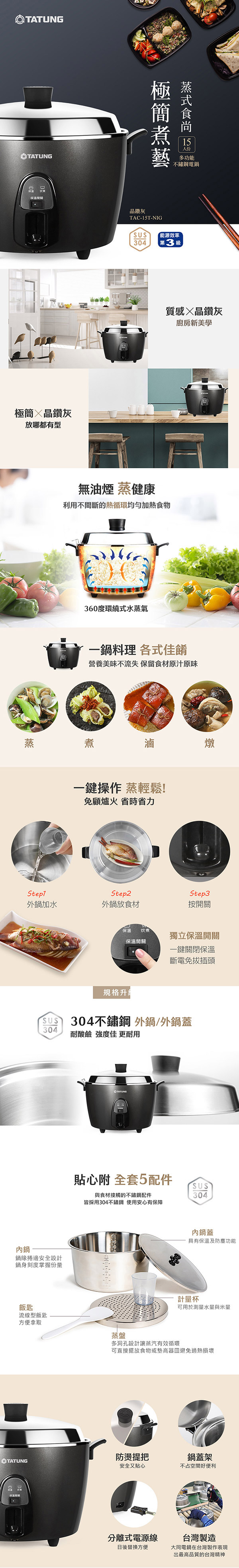 (2) 鍋蓋、內鍋、蒸盤均為SUS 304 不鏽鋼。