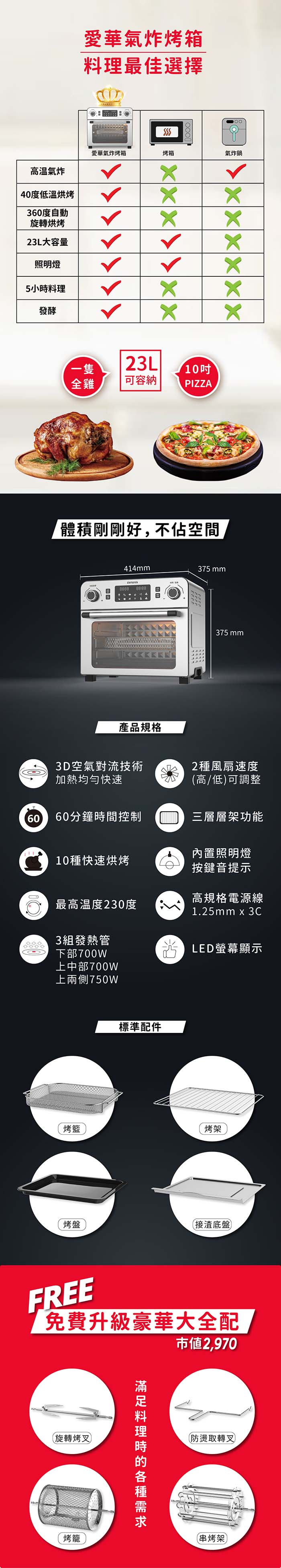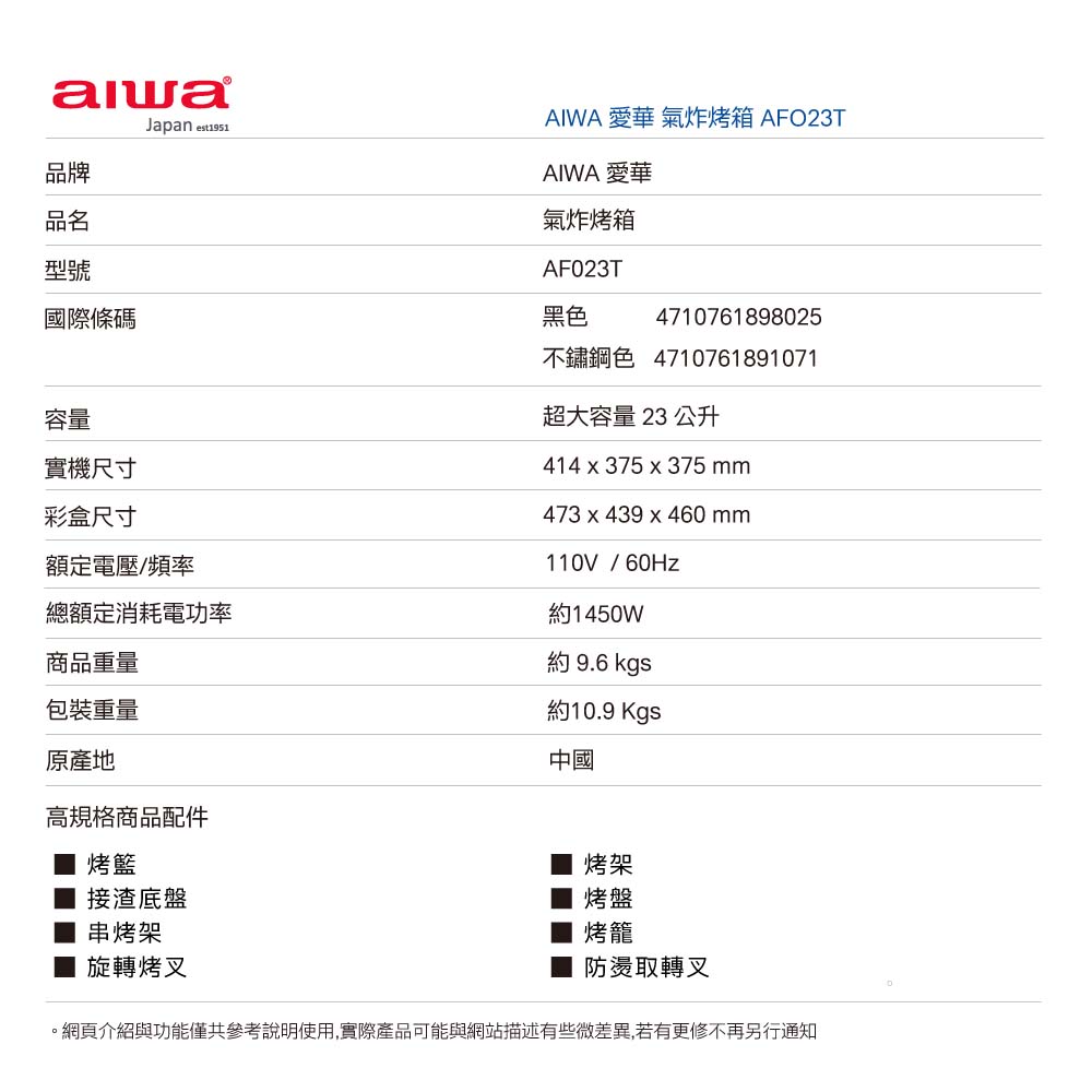 內容物:主機、烤藍、接渣底盤、串烤架、烤架、烤盤、烤籠、旋轉烤叉、防燙取轉叉